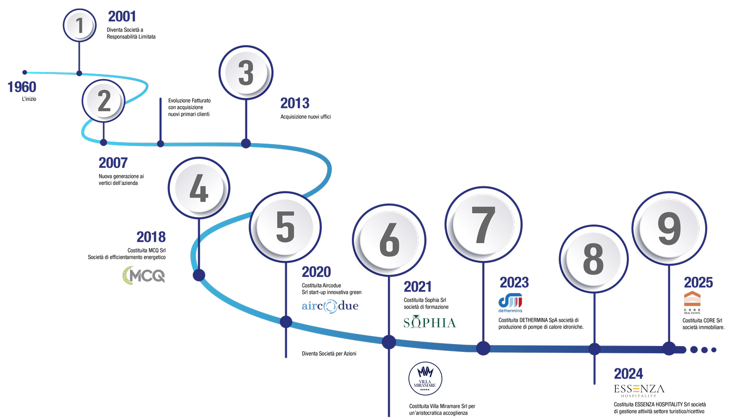 Il significativo passaggio generazionale, iniziato nel 2007, unitamente all’ingresso in azienda di un team di manager di forte spessore professionale, ha permesso l’approccio a nuove esperienze imprenditoriali concretizzatesi nel tempo, nella creazione di diverse controllate operanti nel settore dell’energia, dell’innovazione tecnologica, della ricerca e sviluppo, della formazione, del turismo ed in quello immobiliare